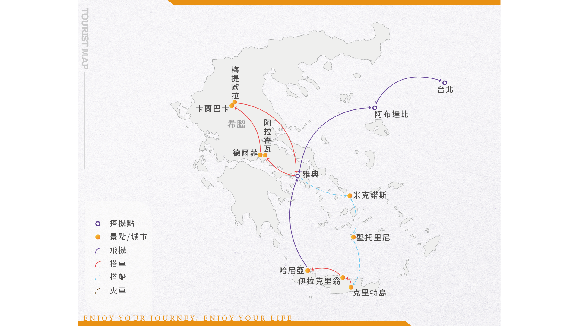 希臘這個浪漫的國度,無論是讓人把心遺留在愛琴海島嶼,或是印證遠古傳說的遺跡,在在都令人流連忘返。謎樣的米諾安文明、黃金王國邁錫尼文明、消失的亞特蘭提斯,曾是人們以為的神話傳說。而今隨著挖掘考證各地遺跡一一呈現在世人眼前。天境般的愛琴海島嶼,交織著希臘眾神的愛恨情仇,一起勾勒出浪漫、迷人的島嶼風情。~天與海交會、藍與白相戀的地方~