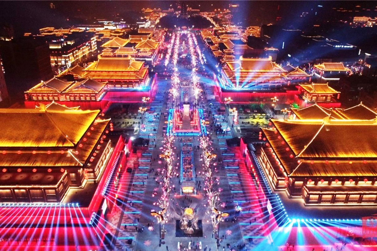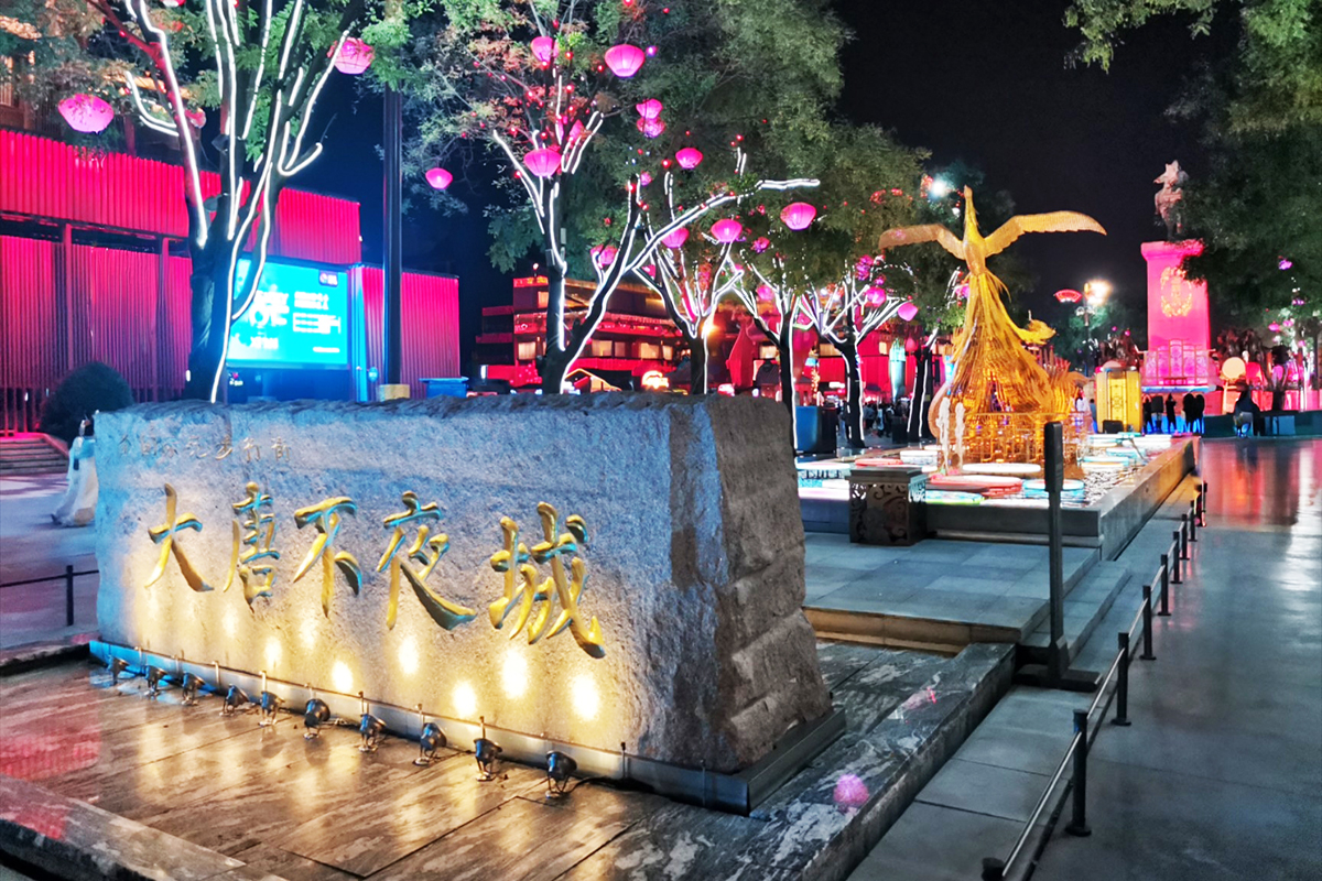 【大唐不夜城】全國唯一以盛唐文化為背景的大型仿唐建築群步行街。街區北起大雁塔南廣場,南至唐城牆遺址,總長2100米,占地65萬平方米,包含玄奘廣場、貞觀廣場等四大文化廣場及西安音樂廳等四大場館。其以盛唐中軸線為核心,通過仿唐建築、雕塑群(如“貞觀之治”“開元盛世”主題雕塑)及燈光秀,全方位還原唐代風貌。
