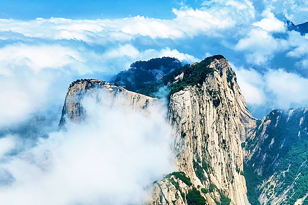 華山~奇險峻絕如刀削斧劈,絕崖千仞似天工雕琢。整座巨石巍峨聳立,雲海翻騰時仿若仙山浮空,夕陽為峰頂鍍金,霞光四披如入幻境。