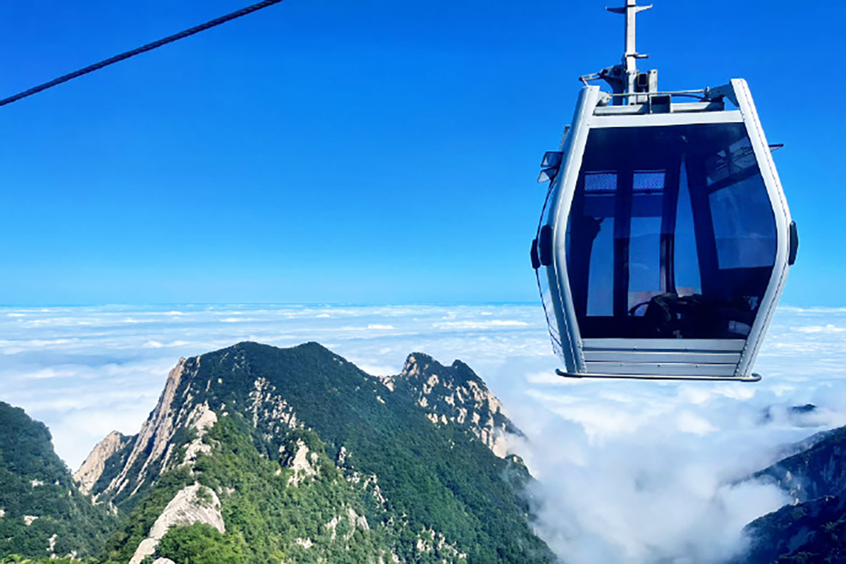 【西峰纜車】以其險峻壯觀的景色和先進的工程技術著稱。索道全長4211米,相對高差894米,採用世界首創的崖壁開鑿硐室站房設計,運行速度最高6米/秒,單程約需13-18分鐘。乘坐索道可俯瞰蓮花峰、落雁峰等主峰壯麗景色。