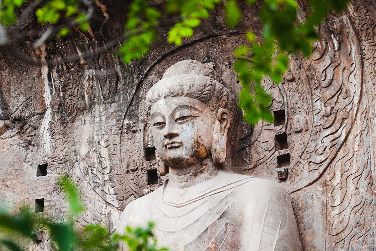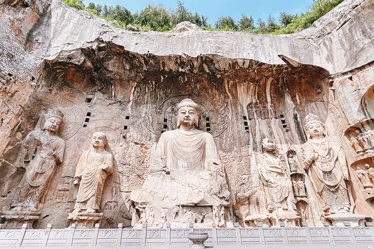 【龍門石窟】中國三大佛教藝術寶庫之一,與敦煌莫高窟、大同雲岡石窟齊名。石窟始鑿于北魏孝文帝時期,歷經東魏、西魏、北齊、隋、唐、北宋等朝代,持續開鑿400餘年,迄今已有1500多年歷史。現存窟龕2345個,造像近11萬尊,碑刻題記2800餘塊,佛塔70餘座。其中,奉先寺的盧舍那大佛高17.14米,據傳是仿照武則天容貌雕刻,被譽為“東方蒙娜麗莎”。
