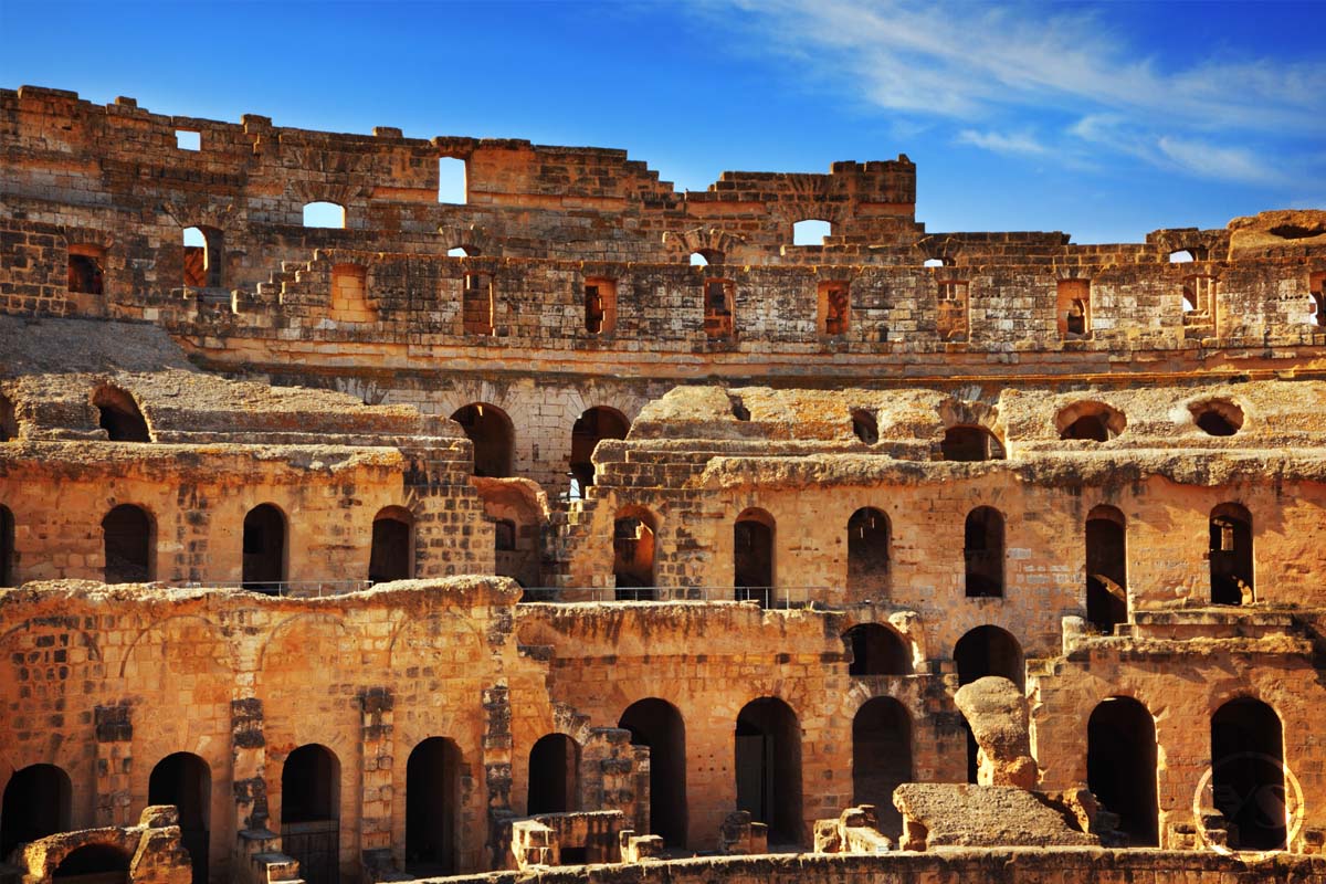 五月天《為愛而生》的MV就是在這個競技場拍的。建於西元230年-238年,是世界上保存最好的競技場之一,完整的羅馬拱訴說著羅馬建築技術的精湛,為非洲最大、世界第三大的羅馬式競技場。保留完整的地下室格鬥士休息區域,甚至獅子抬升的洞口都被保留下來,走在幽暗的地下走道當中,您可以經歷神鬼戰士般的感受,可以想像格鬥士面臨生死一瞬間的格鬥活動時,有著多高的心理壓力。伊爾傑羅馬競技場三層樓高的座位區共可容納三萬五千名觀眾,如今保存下來的是第一層座位區,在統治者的看台上,您可以想像羅馬如何運用競技場統治著羅馬帝國。