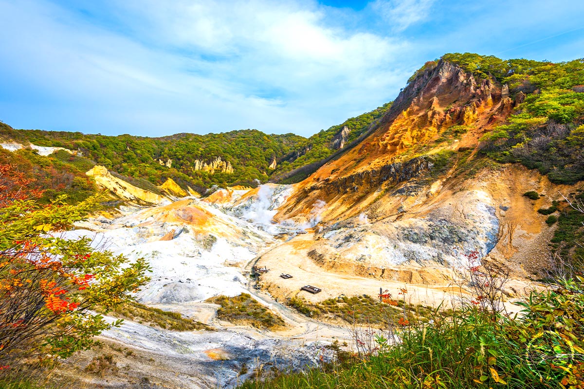 【登別地獄谷】位於登別溫泉街的東北側,是約1萬年前發生的笠山爆發所形成的噴火口,溫泉的出水量每分鐘高達3000立方公升,為登別最大的泉源,依地點不同,湧出之源泉水質亦不相同,可達11種之多。