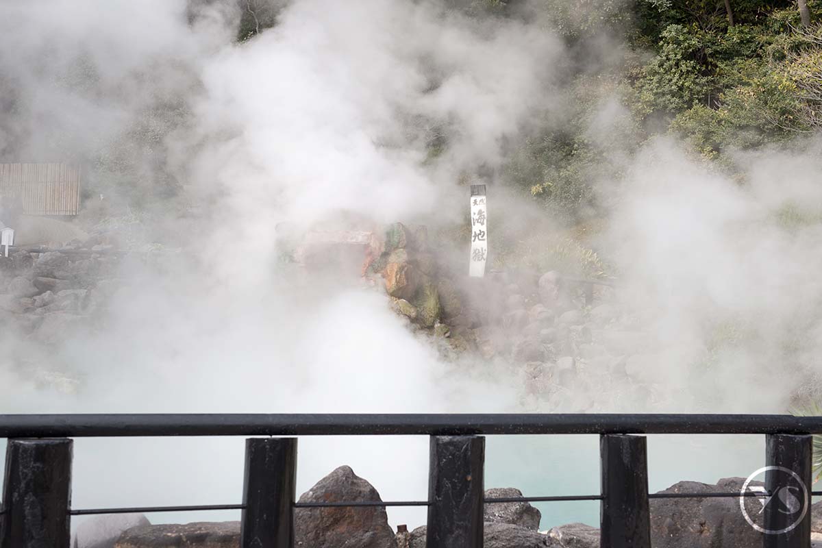 【別府海地獄】別府聚集了8個有名的地獄,其中海地獄在八大地獄中佔地最大,1200年前因富含硫酸的泉水湧出,呈現海洋一般湛藍的景象,而得名。