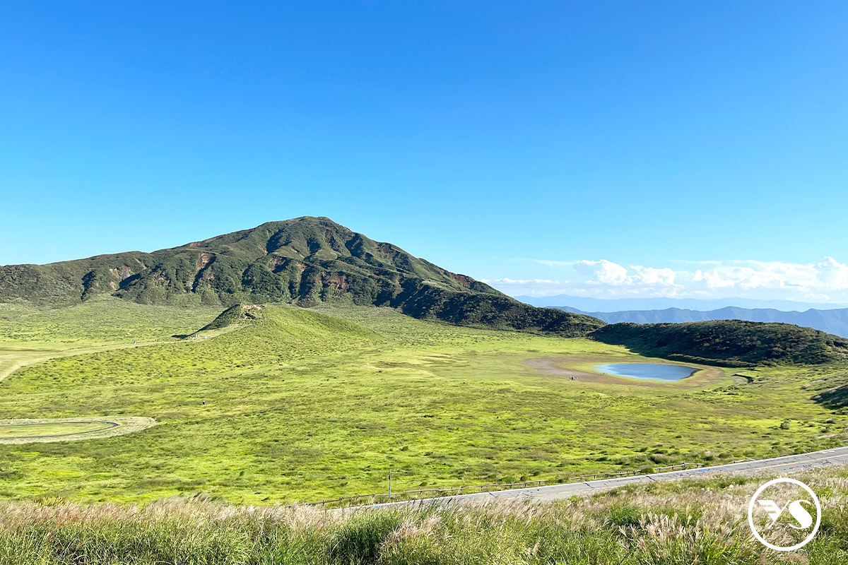 【草千里】草千里絕佳的地理位置,在此能看見中岳火山的噴煙。接近四角形狀的大草原,一直延伸到了烏帽子岳北麓,不管是草原中央的大水池,或是放牧中的馬兒,總能讓人找到牧歌裡的情境。碧綠鮮豔的夏季、銀白幻想的冬季,一年之中吸引眾多觀光客前往的,除了四季變換的色彩,還有騎馬跟散步。草千里不僅僅是阿蘇代表性的景點之一,它廣闊的風景,更被許多和歌詩人吟唱著。