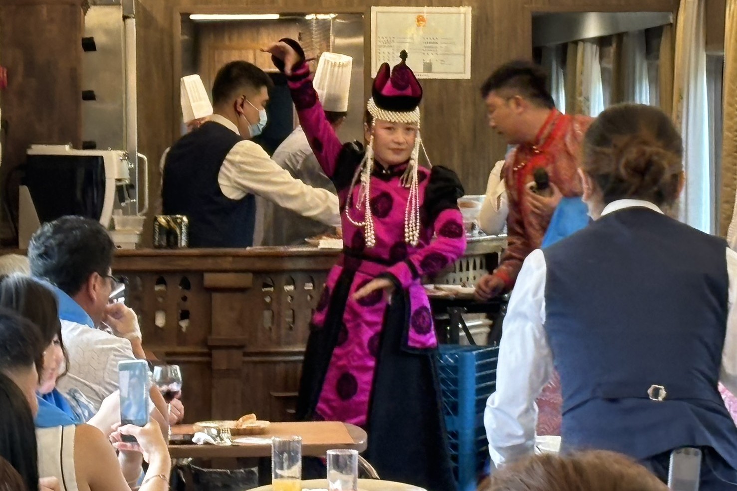 第8車廂~巴雅爾餐車(胡桃木內飾及蒙古特色的窗簾紋飾充滿主題色彩;滿載44位客人共用中俄蒙三國美食精華)