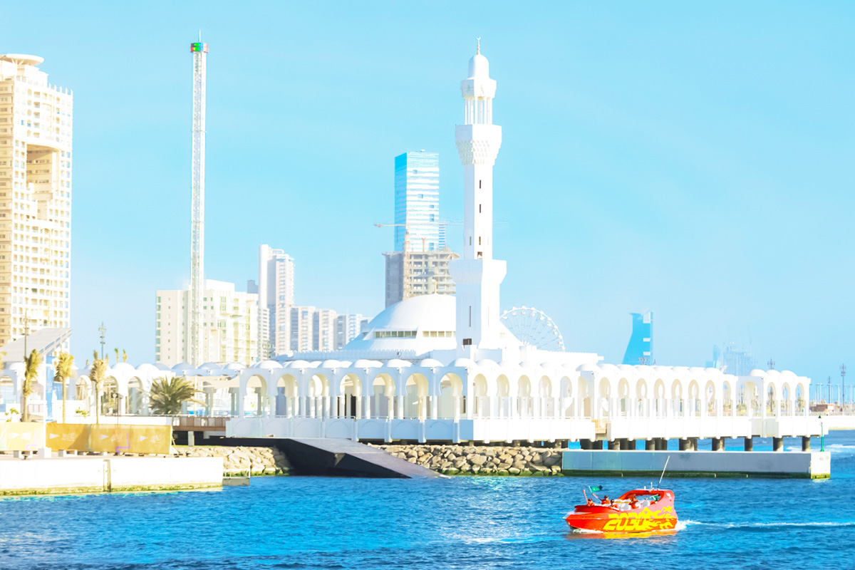 ★拉赫瑪清真寺/水上清真寺Al-Rahmah Mosque/Floating Mosque建於1985年,是吉達最受歡迎的清真寺之一。漲潮時看起來就像是漂浮在紅海的海面上,所以又稱水上清真寺。它以明亮的白色和綠松石色的圓頂為標誌,特別是當陽光照在上面時,它描繪了一幅美妙的景象。當您進入清真寺,看到現代和創新的建築風格,您會被天花板上的銘文裝飾和大玻璃窗所震撼,為信徒提供海景,融合了這個地方的靈性與風景的壯麗。這座清真寺還以其壯觀的綠松石圓頂而聞名,圓頂上裝飾著巨大的枝形吊燈,由8根柱子高高舉起。