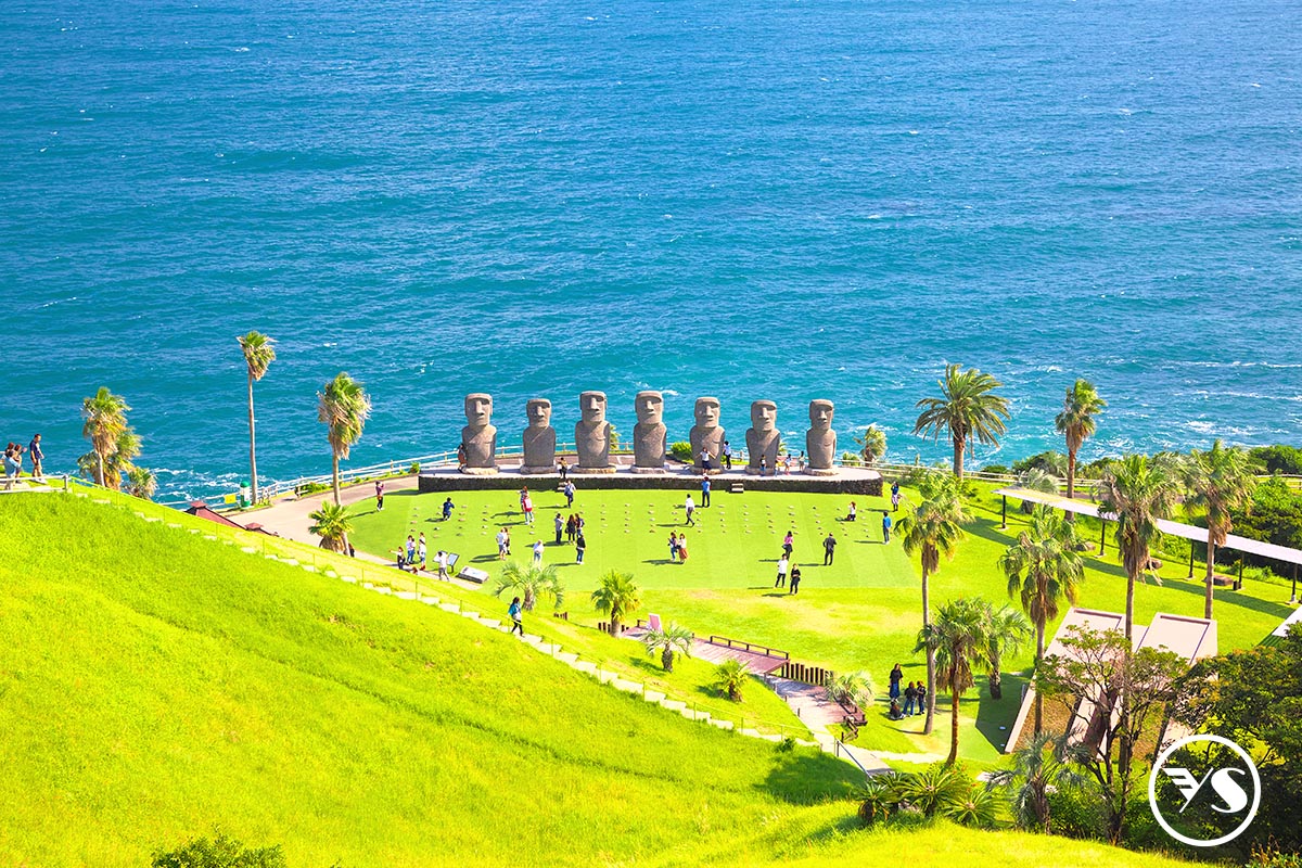 【日南太陽花園】位於日本宮崎縣日南市海岸線上的日南太陽花園,是一處結合海景、異國風情與悠閒氣氛的特色景點,也是南九州相當具代表性的觀光地之一。其中最吸睛的,莫過於智利復活節島的長老官方授權興建的7座摩艾石像,每一座代表著不同的意思,包括事業、健康、愛情、整體、婚姻、財運和學業。園區內也設有展望空間與小型設施,適合親子或朋友一同造訪。