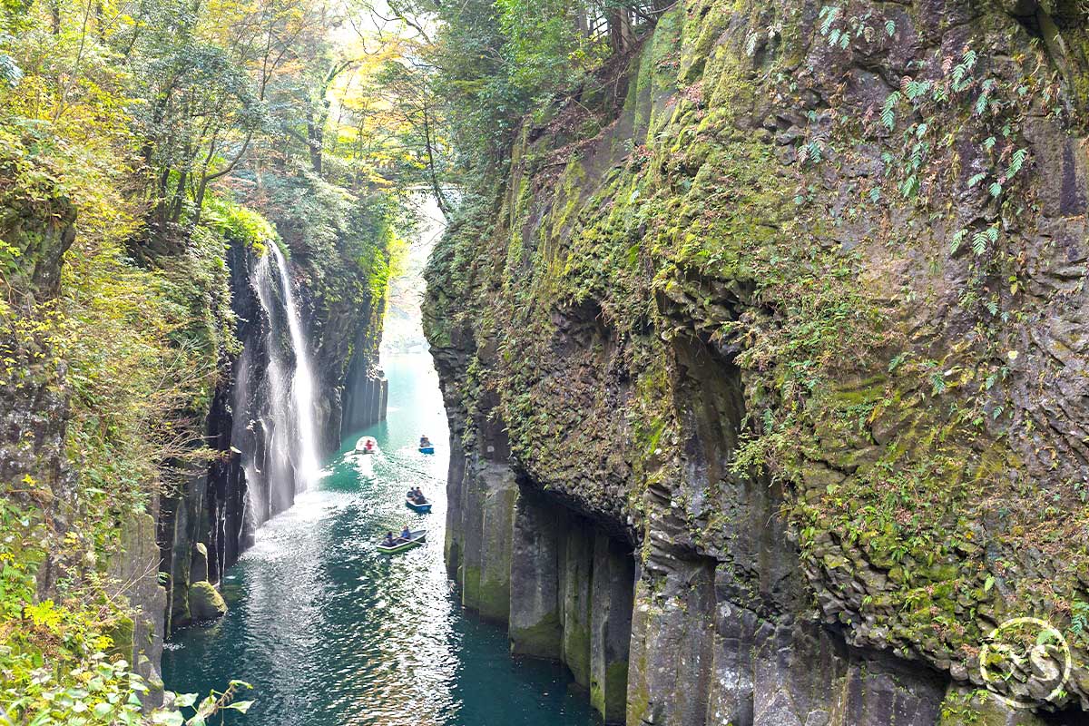 【高千穗峽】在日本的神話裡,宮崎縣高千惠街的深山裡有一處聖地,高度高達80米~100米V字型的溪穀橫跨7千米,是「高千惠峽谷」的一大象徵,同時也被日本瀑布100選選中的「真名井瀑布」。從五瀬河經過高千惠峽谷的斷崖,猶如髮絲般垂直流動的瀑布,是多麼壯觀、具有幻想的風景。