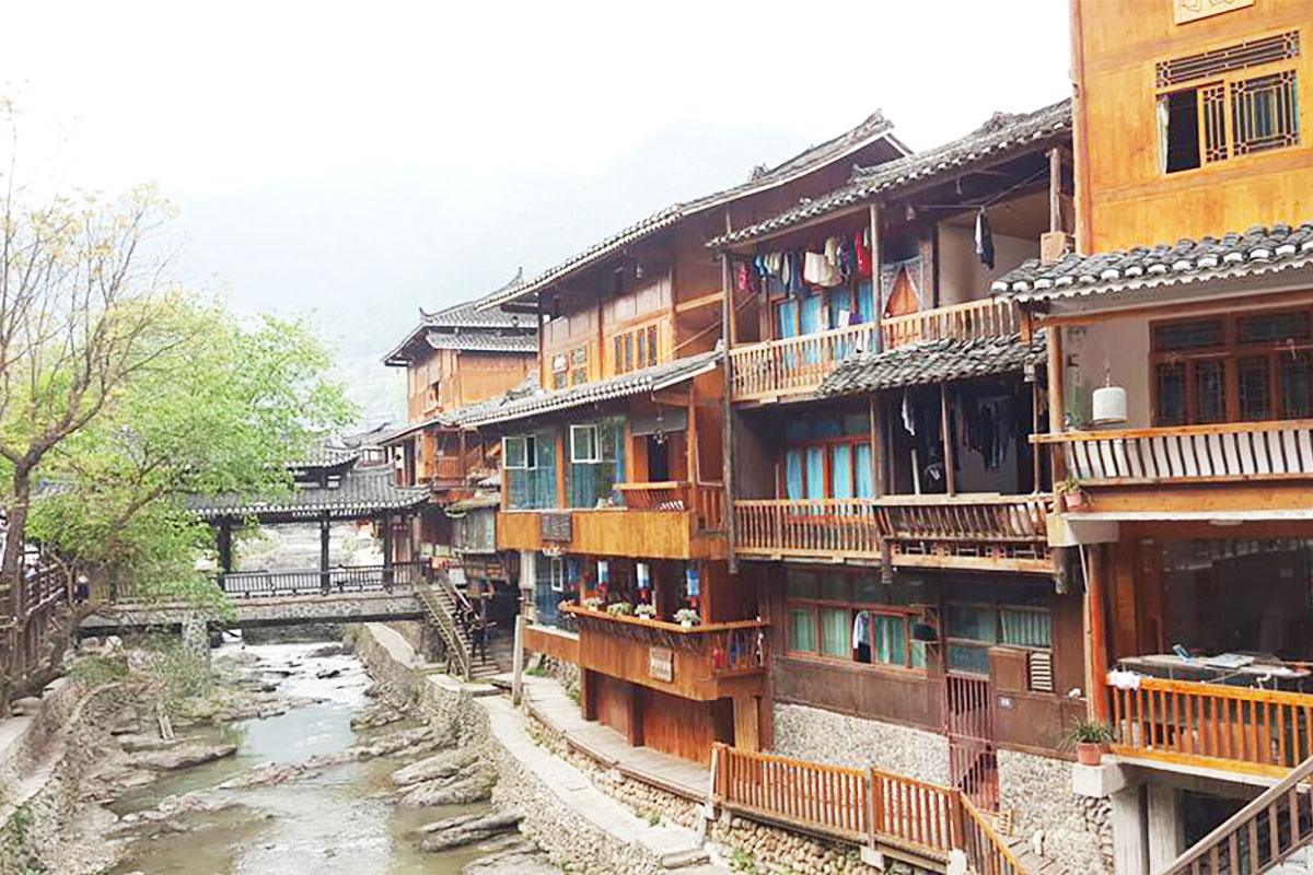【西江千戶苗寨】是聞名遐邇的世界第一大苗寨,四面環山,重巒迭嶂,梯田依山順勢直連雲天,白水河穿寨而過將西江苗寨一分為二,全寨共有一千二百八十五戶人家約五千多人而因此得名千戶苗寨,寨內吊腳樓層層迭迭順山勢而建又連綿成片,房前屋後有翠竹點綴,而吊腳樓多為三層,基座以青石、卵石壘砌,一層圈養牲畜二層住人,三層為糧倉,居住層有長廊,圍有木欄並設有長凳,苗家姑娘多在此挑花刺繡,人稱此長廊木凳為《美人靠》。