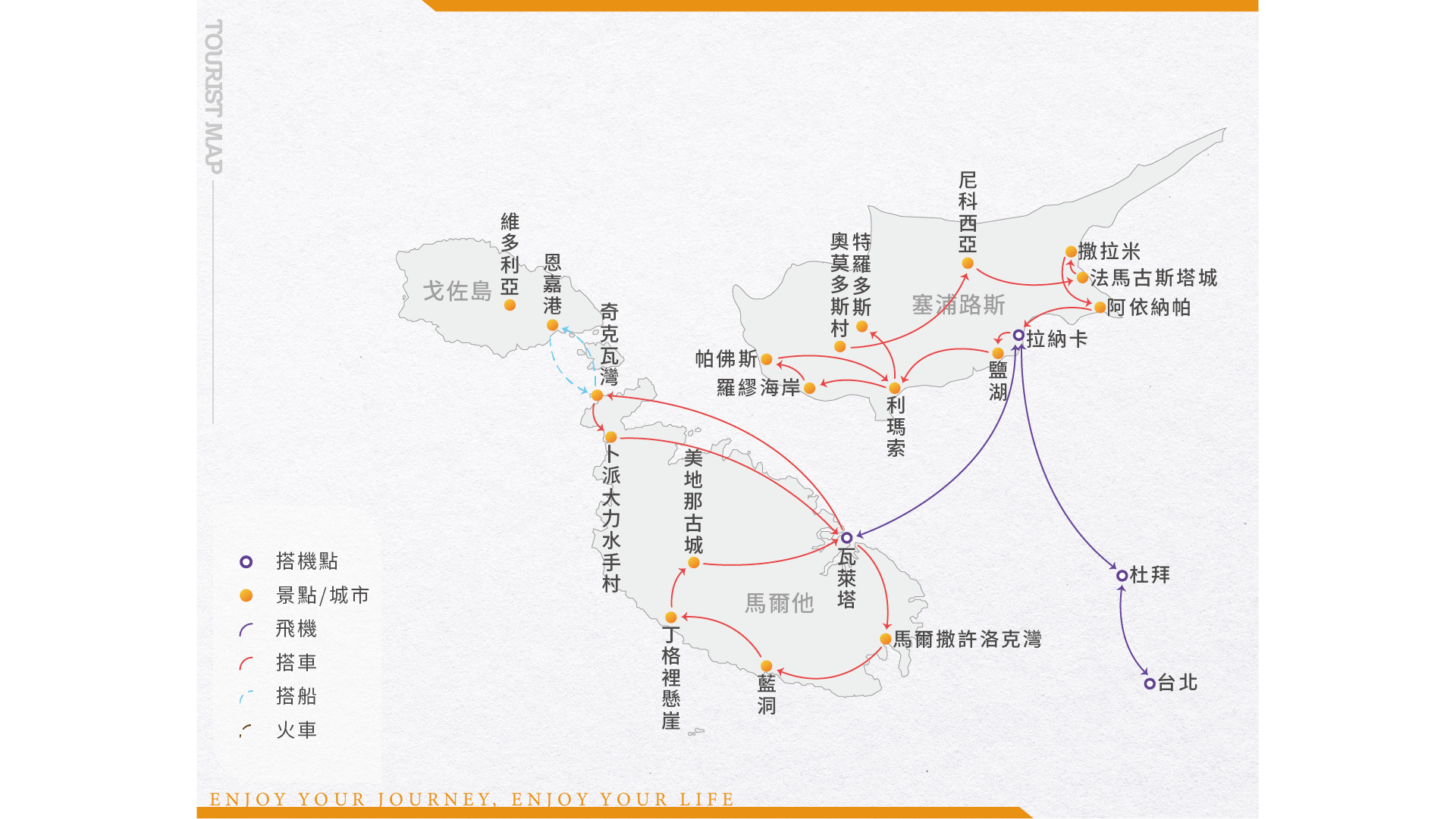 塞浦路斯是傳說中女神愛芙羅黛蒂的出生之處,其絡繹不絕的 愛慕者自古即渴求和爭奪著這塊土地:如邁錫尼人、埃及人、亞述人與波 斯人等,不勝枚舉。最近為爭奪這塊前英國殖民地而大打出手的則是土耳其人與希臘人。也由於這段動盪的歷史,使其留下從十字軍城堡到穆罕默德姨母之墓等一系列動人心弦的文化瑰寶。該島嶼的海岸線綿長而中央多山的地形,保證讓遊客全年都有不同的活動可參加。為此我們特別安排造訪南北塞浦路斯景點之最: