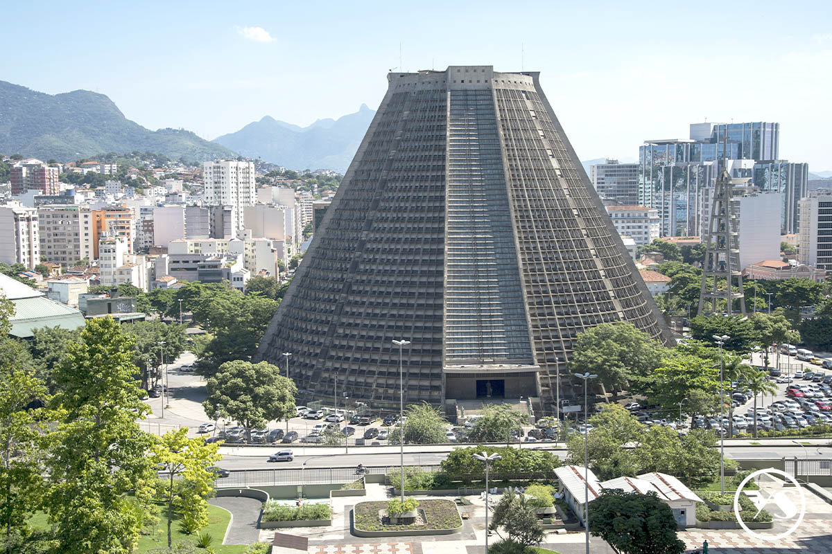 繼續前行,我們將到達聖塞巴斯蒂安大都會教堂Catedral Metropolitana,它是一座金字塔形的建築,內徑96米,高80米。是位於巴西里約熱內盧的一座現代風格的教堂。 這座教堂以其獨特的圓錐形外觀、由規則方框構成的「天梯」造型而聞名,並因其內部壯觀的彩色玻璃和巨大的耶穌像而吸引眾多遊客。 它於1964年至1979年間建成,是里約熱內盧天主教總教區的主教座堂,紀念該市的守護聖人聖塞巴斯蒂安。