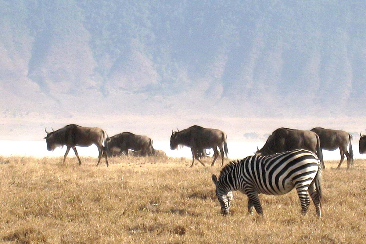 今日帶著愉快的心情即將進入此次行程的重點,恩戈羅恩戈羅保護區Ngorongoro Conservation Area,約300萬年前,恩戈羅恩戈羅火山爆發,產生的火山灰蓋滿了塞倫蓋堤區。今日的火山口是有『亞當花園』之稱。我們來趟恩戈羅恩戈羅火山口Ngorongoro Crater狩獵行程,我們由海拔約2400公尺的火口壁順著小路往下進入火口平原(海拔約1800公尺)內,這裡水源地集中,自成一個生態食物鏈系統,很容易就能看到不須遷徙的斑馬、牛羚等野生動物群。1979年,被聯合國教科文組織列為人類自然遺產。雖然整個 Ngorongoro 保護區佔地足足有 8,288 平方公里,但遊客的焦點,都集中在那面積260平方公里,深600多公尺的死火山口。這巨大的火山口就像活生生的生物教科書,給我們講解甚麼是生態系統,甚麼是生態平衡。大約2.5萬頭大型動物,生活在這地理上半封閉的地方。食肉動物,被吃的食草動物,被吃的草,動物的糞便肥料等等,構成一個存在了數以萬年的、自給自足的生態系統。