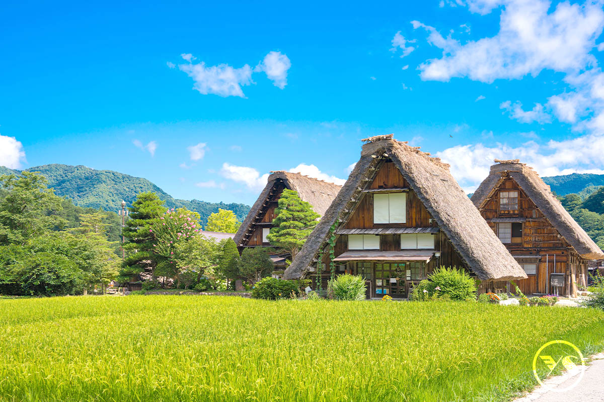 【白川鄉合掌村】世界遺跡之處,將兩個建材合併成叉手三角形狀屋頂,稱為「合掌」,可減少受風力,且調節日照量,使屋內得以冬暖夏涼。因在深山之故,從古以來居民被大自然之天氣變化考驗而集智慧之結晶以稻草蘆葦合掌形之屋頂建築住屋來維持嚴東下雪天數多之安全。因整個村莊都同樣之建築模型,幾百年均沒改變完整保留下來,今人特別感到不同社會之情景。