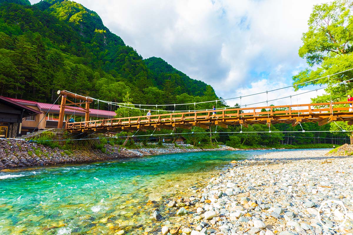 【上高地】被日本人視作神的故鄉,上高地是標高約1500公尺的小盆地,四周被燒岳、常念山脈、穗高連峰等高山環抱,屬於中部山嶽國立公園。古時被稱為 "神鄉地",相傳是神居住的地方。經19世紀之英國傳教士兼登山家沃思特•威斯頓的介紹而廣被全世界的登山家所知,成為日本著名的風景勝地。這一帶被白樺、落葉松等的原始森林環繞,大正池、田代池、明神池等分佈在其間,與高聳的各山群的雄姿一起構成了極美的景色。大正池是20世紀初由於燒嶽的噴火、梓川受堵所形成的池。其藍色的水面上突顯的枯樹與周圍構成一種獨特的風景。而搭建在梓川上的河童橋現已成為上高地的標誌;河童橋長36.6M、寬3.1M,為木制的吊橋。站在橋上看著眼前聳立的穗高連峰,遠眺南面燒岳嫋嫋上升的白煙,被稱為上高地最好的風景勝地,真是宛如人間仙境。