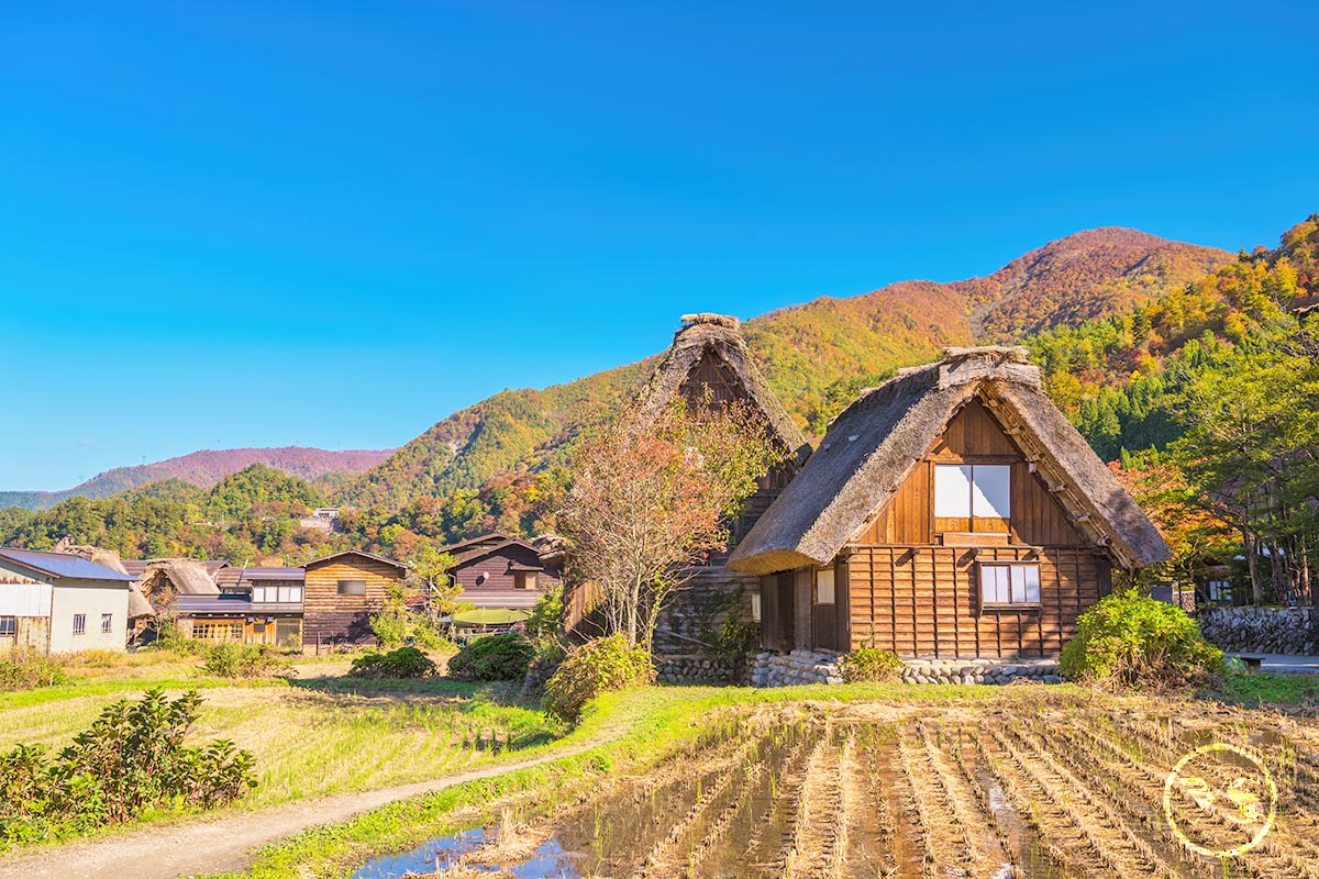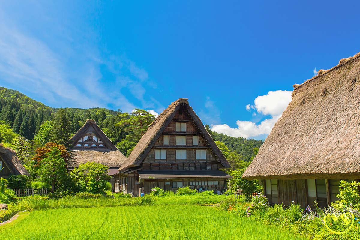 【白川鄉合掌村】世界遺跡之處,將兩個建材合併成叉手三角形狀屋頂,稱為「合掌」,可減少受風力,且調節日照量,使屋內得以冬暖夏涼。因在深山之故,從古以來居民被大自然之天氣變化考驗而集智慧之結晶以稻草蘆葦合掌形之屋頂建築住屋來維持嚴東下雪天數多之安全。因整個村莊都同樣之建築模型,幾百年均沒改變完整保留下來,今人特別感到不同社會之情景。