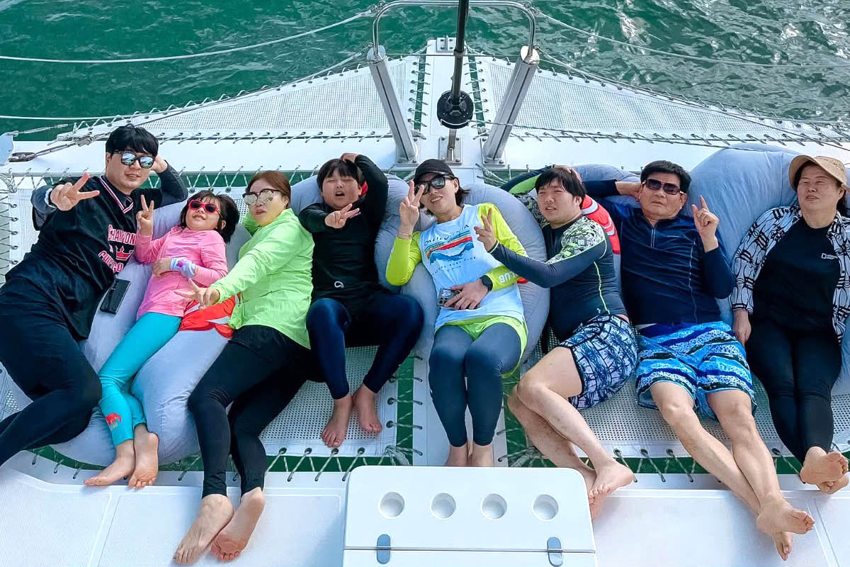 隨著船在定點停航,此時大夥可以拿著浮潛裝備,大家可以下海去暢游,並可有機會與熱帶魚載著碧藍色的海域一起共游;或者您可以在船頭拿著傳家特別準備的釣具,來個天才釣手的趣味比賽,比看看誰才是真正的天才小釣手;亦或者您可以在船頭的透風網狀躺床,繼續當網美,多多拍些美照,將這美照曬到個人臉書或IG上,保證流量大增。另外,船家亦準備了時下最流行的SUP立槳,您可以划著立槳親近這片藍到不像話的大海,快快樂樂地度過一個海洋愉快假期。