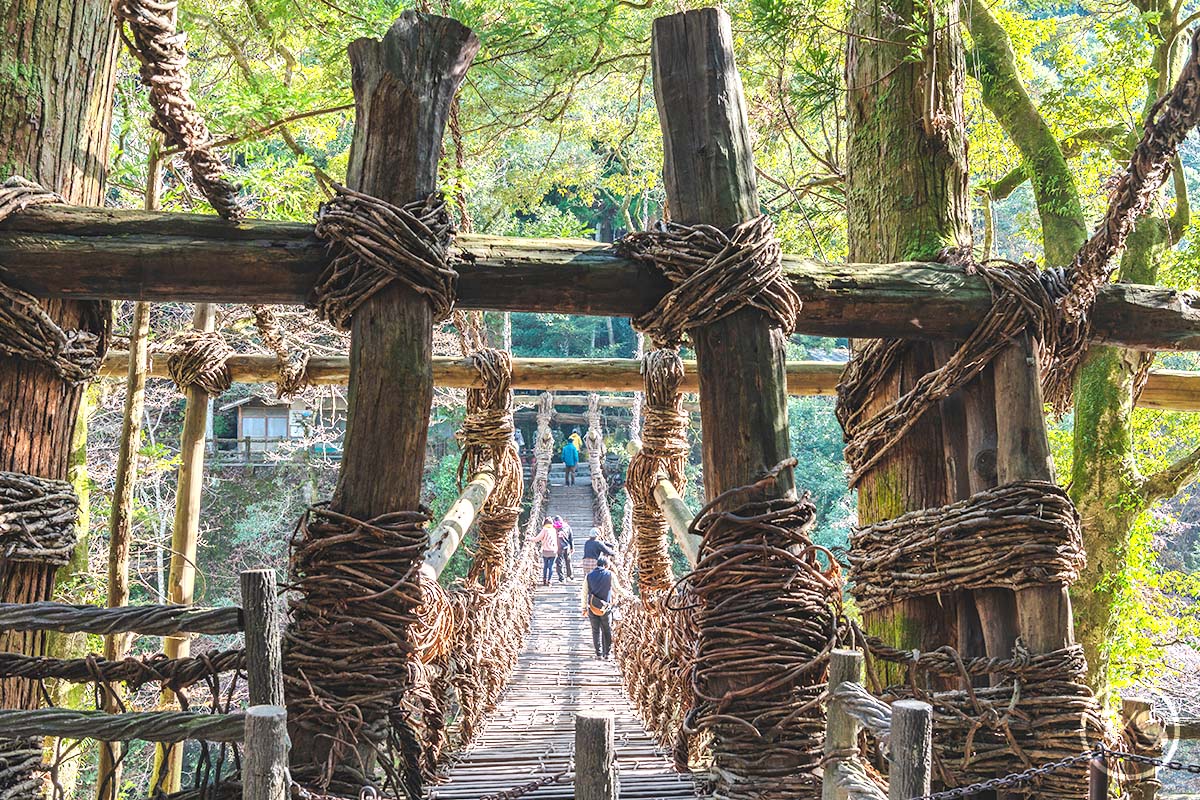 【祖谷溪吊橋】蔓藤橋是從秘境奧祖谷中長出來藤蔓編織而成的橋,為日本三大奇橋之一。據說是800年前,由當地最大勢力的平家為訓練馬匹所架設。