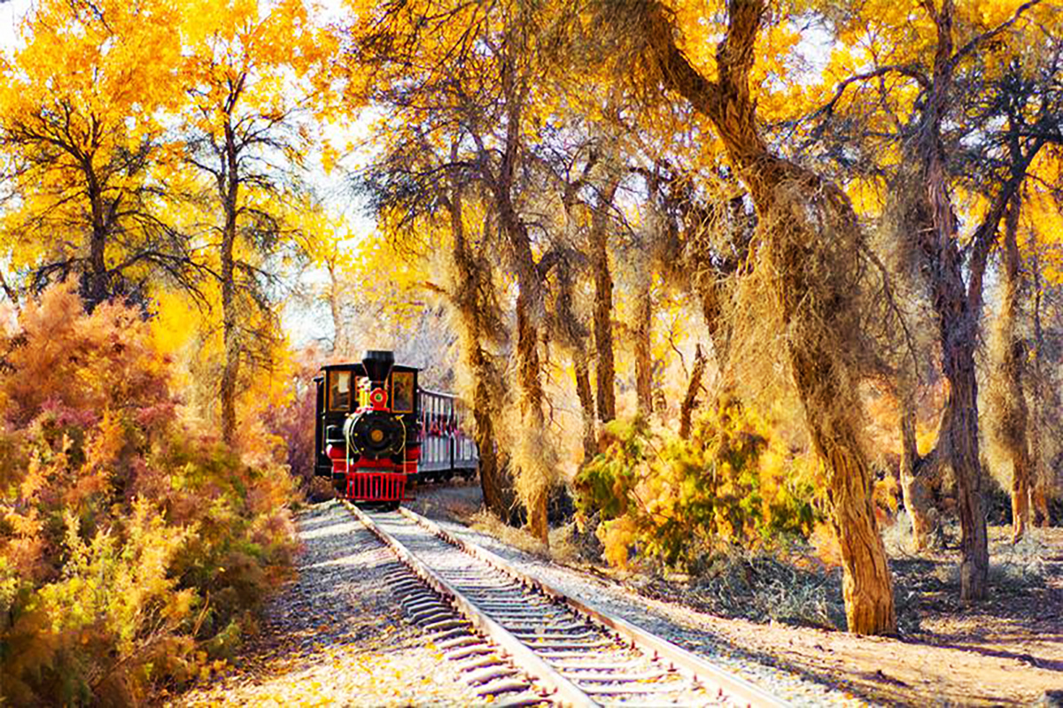 全球面積最大、分佈最密的天然胡楊林,占地100平方公里,被譽為“世界胡楊看中國,中國胡楊看輪台”。三面環沙,一面臨河,是塔克拉瑪幹沙漠北緣的“綠色長城”,守護著絲路古道的生態屏障。小火車路線沿途會經過綠草地、紅柳叢、蘆葦蕩、恰陽河和林中湖,景色非常豐富。車廂是復古設計,拍照特別出片。