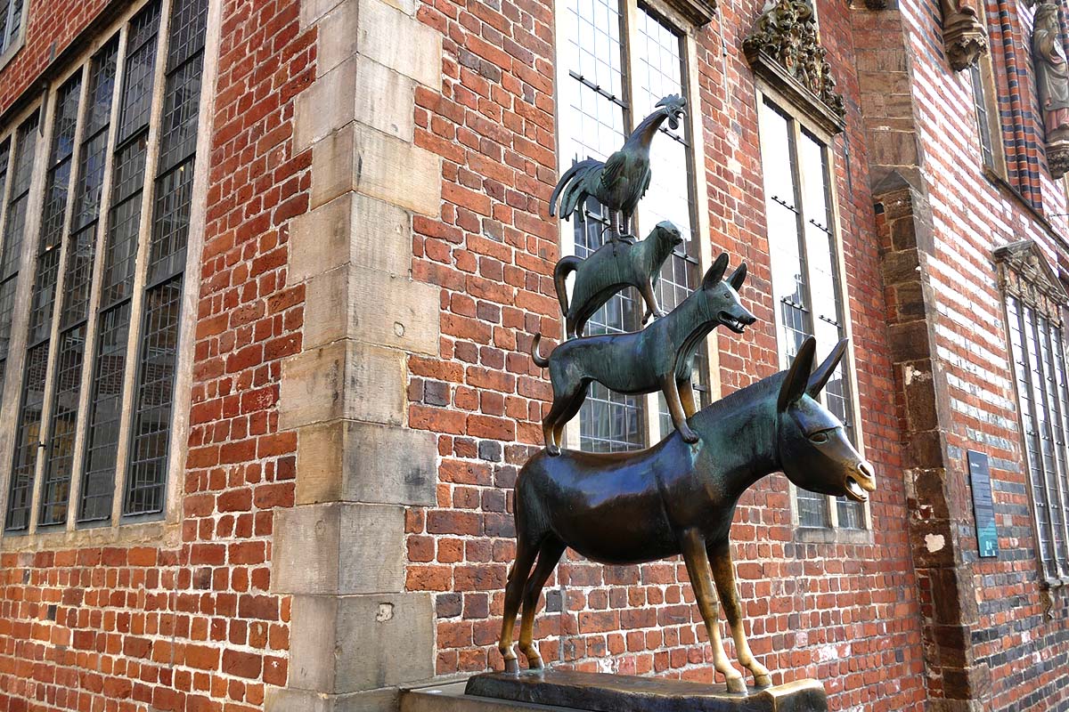 不萊梅-位於童話大道的終點站不萊梅,最著名的故事就是由驢子、老公雞、老狗、老貓合力趕走強盜的《不萊梅樂隊》(Bremen Musikanten)童話故事。 在古城廣場上,除了有象徵自由與市民權的羅蘭雕像外,就是不萊梅樂團的紀念雕像。廣場旁的聖派崔大教堂(St. Petri Dom)與市政廳,因華麗的外觀遠近馳名,堪稱北德最重要的建築之一。