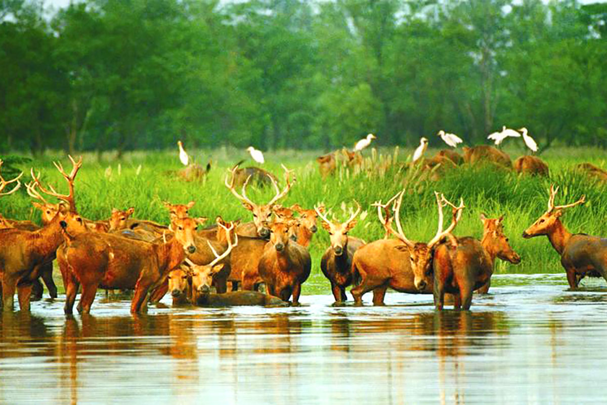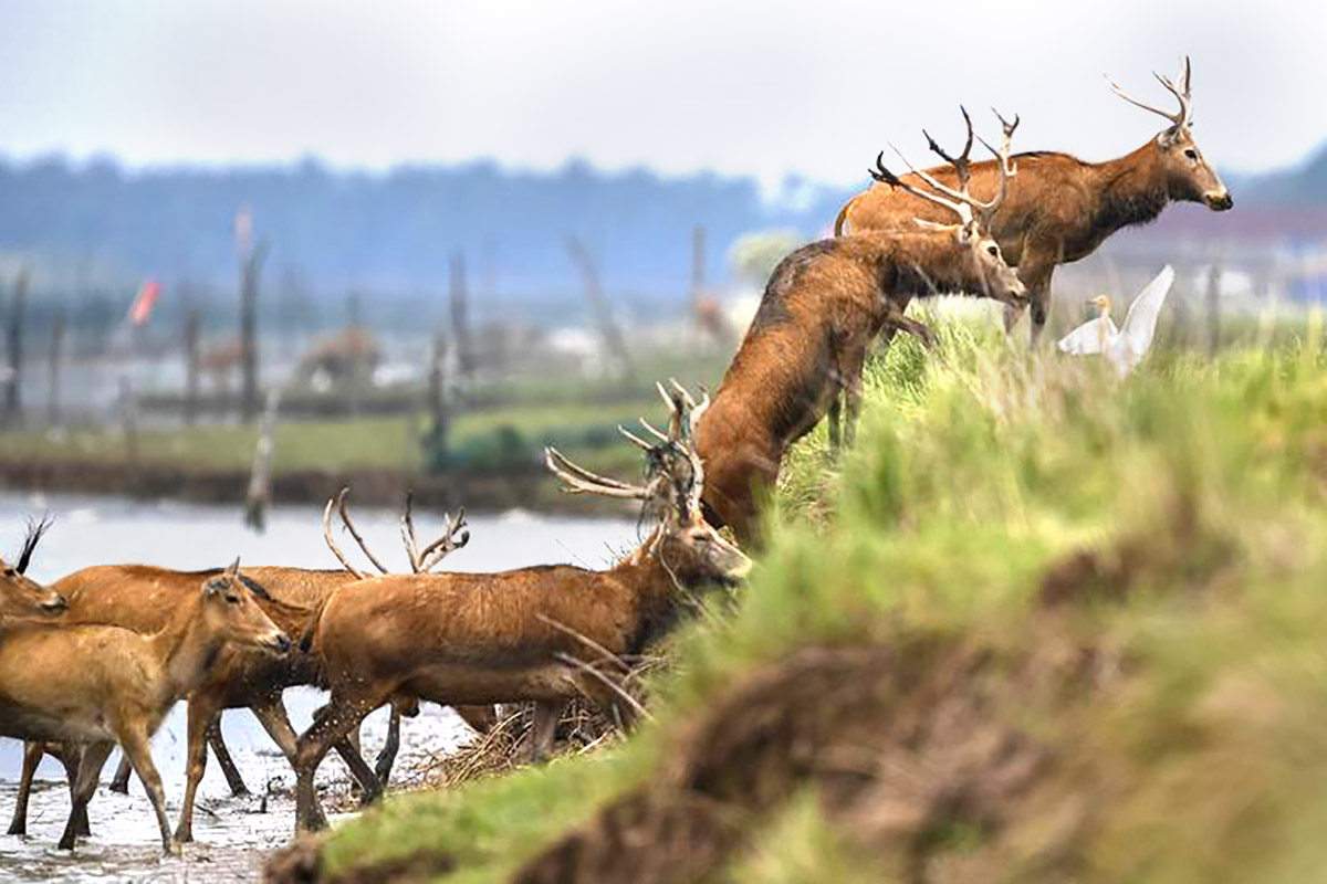 全球最大的麋鹿基因庫與野生種群棲息地,林、草、水、鹿、鳥共生的生態畫卷徐徐鋪展:丹頂鶴振翅翱翔,東方白鸛優雅佇立,耐鹽鹼植物在灘塗頑強生長。漫步其間,既能目睹“鹿王爭霸”的野性角逐。