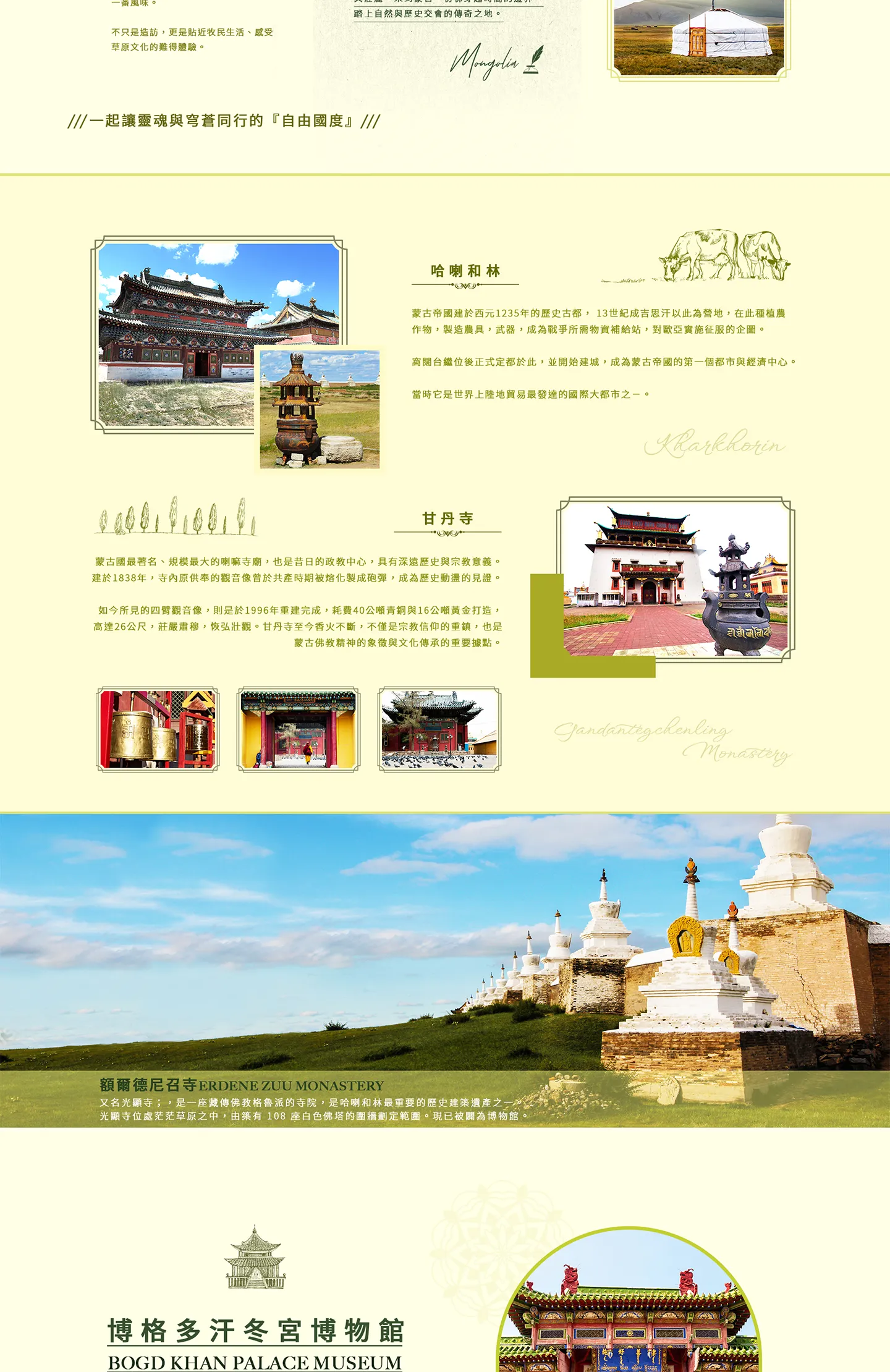 蒙古國最著名、規模最大的喇嘛寺廟,也是昔日的政教中心,具有深遠歷史與宗教意義。建於1838年,寺內原供奉的觀音像曾於共產時期被熔化製成砲彈,成為歷史動盪的見證。