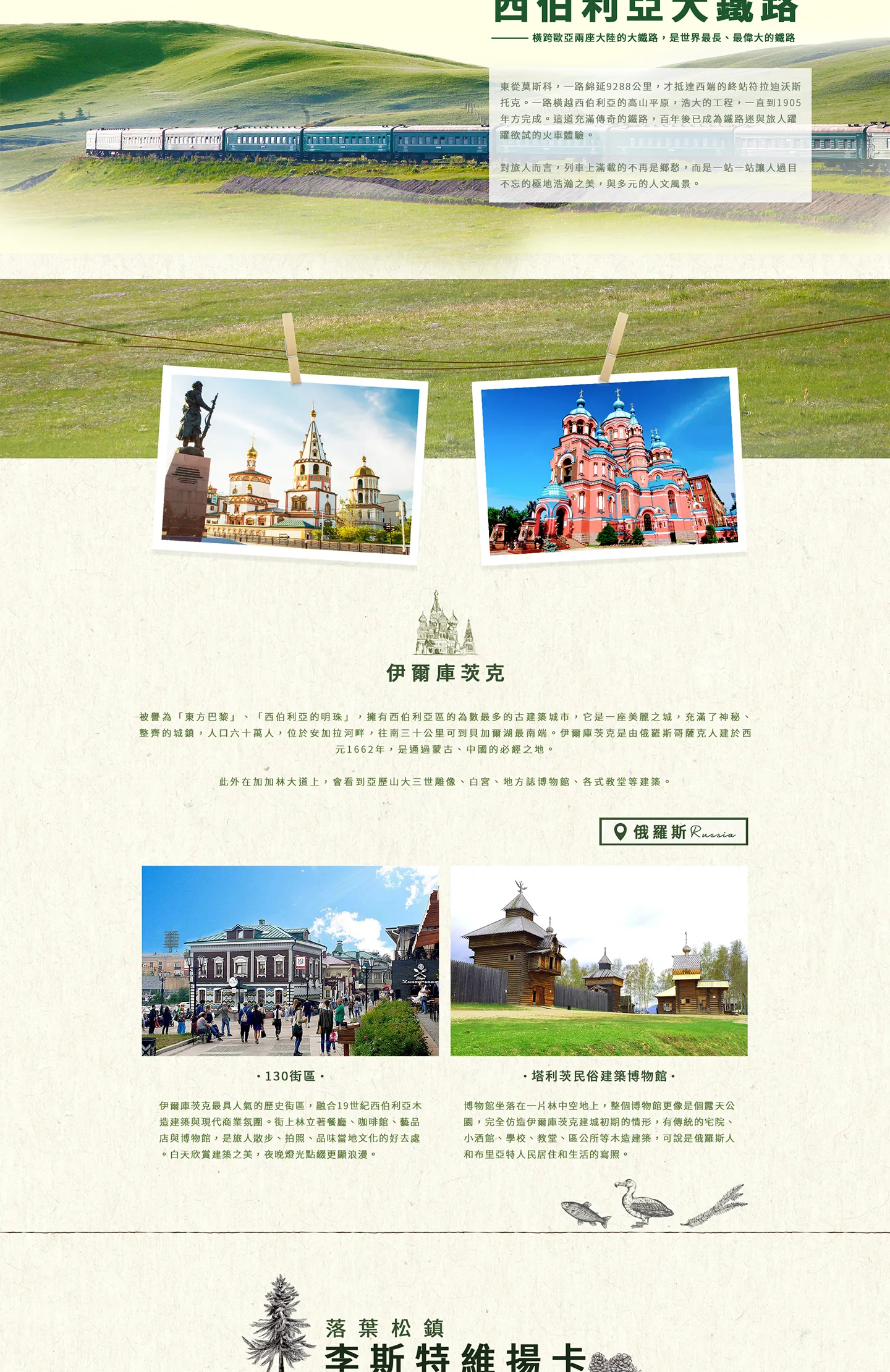 【門 票】:塔利茨民俗建築博物館、貝加爾湖生態博物館、切爾斯基峰登山纜車
