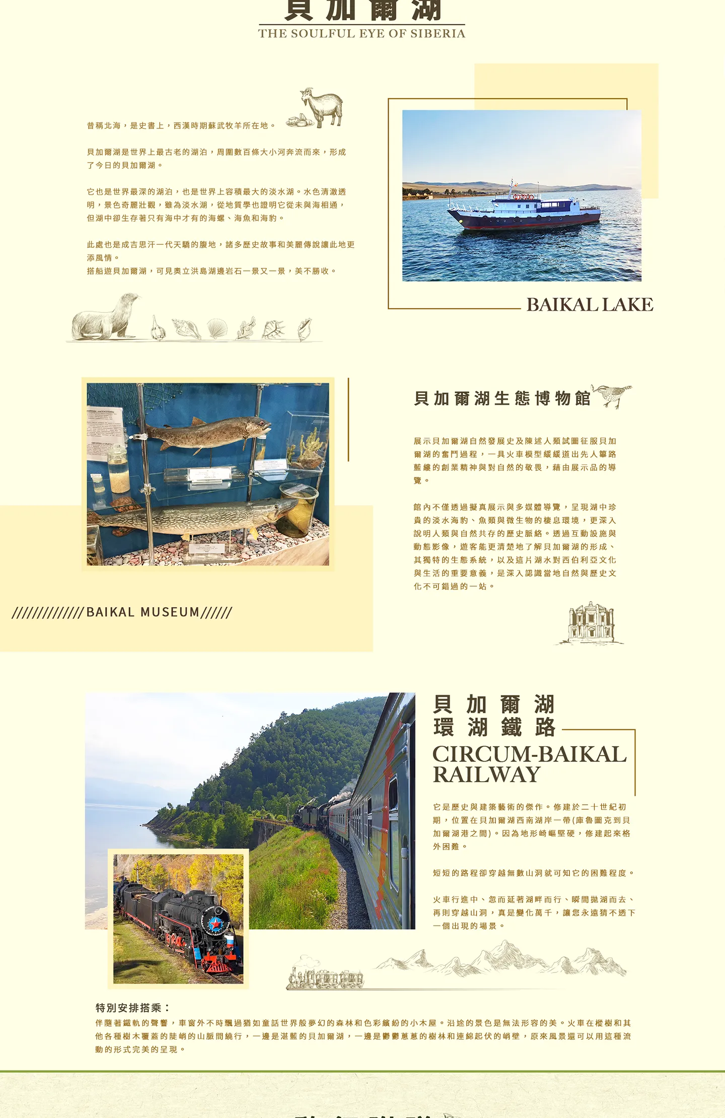 展示貝加爾湖自然發展史及陳述人類試圖征服貝加爾湖的奮鬥過程,一具火車模型緩緩道出先人篳路藍縷的創業精神與對自然的敬畏,藉由展示品的導覽。