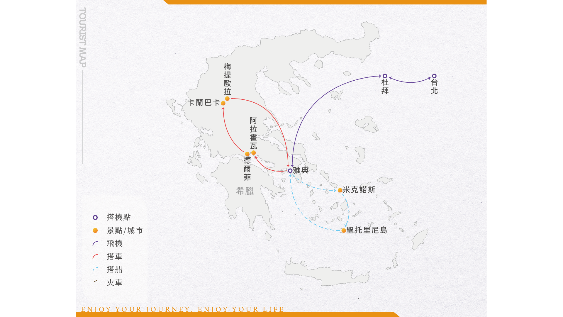 希臘這個浪漫的國度,無論是讓人把心遺留在愛琴海島嶼,或是印證遠古傳說的遺跡,在在都令人流連忘返。謎樣的米諾安文明、黃金王國邁錫尼文明、消失的亞特蘭提斯,曾是人們以為的神話傳說。而今隨著挖掘考證各地遺跡一一呈現在世人眼前。天境般的愛琴海島嶼,交織著希臘眾神的愛恨情仇,一起勾勒出浪漫、迷人的島嶼風情。~天與海交會、藍與白相戀的地方~