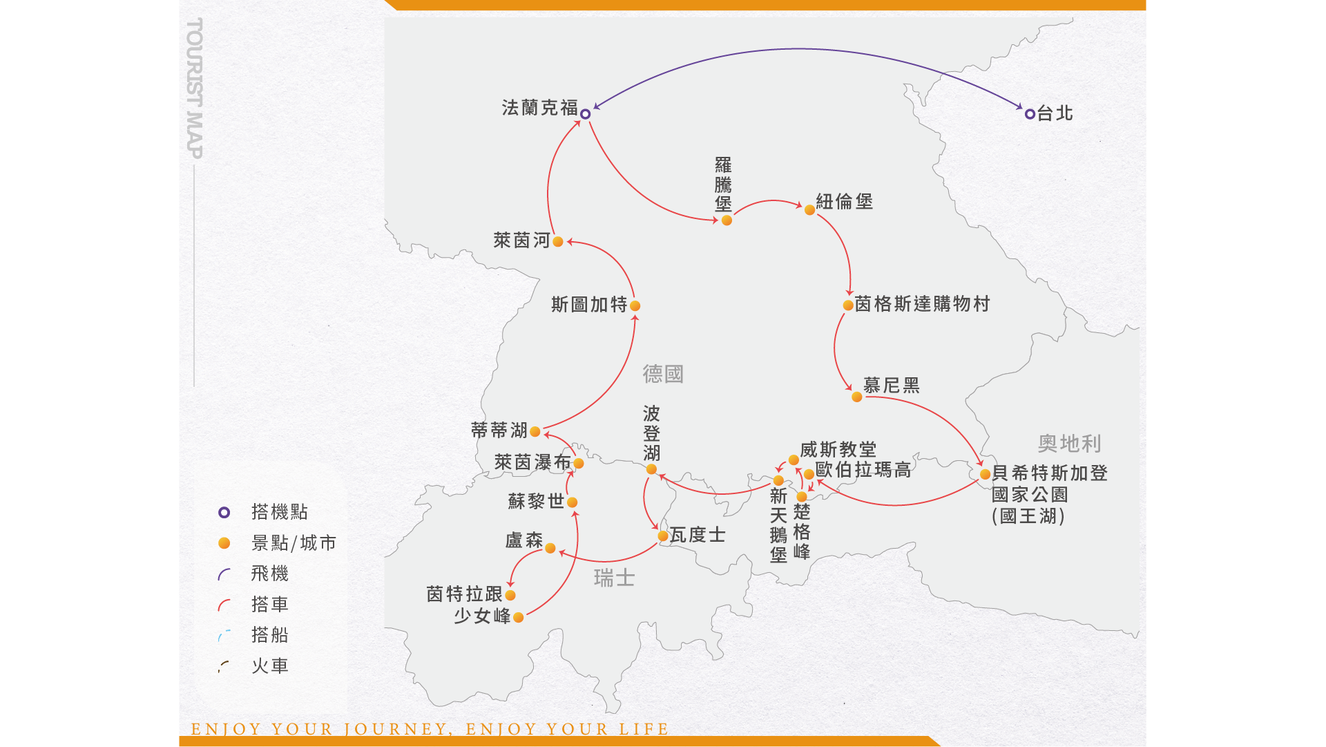 德國~理性和感性的完美協調,浪漫主義城堡與科技工藝精品的國度 山丘上的葡萄園,星羅棋佈的漂亮小鎮,萊茵河兩岸絕壁高聳的岩石上矗立著檸檬黃和薄荷綠的古堡,在這裡彷彿走過時光隧道,塑造了獨特的萊茵河谷美景。無速度上限的筆直公路、風馳電掣的名車、香味四溢種類繁多的德國麵包、世界第一的啤酒大國…德國是您恣意享樂的國度。。