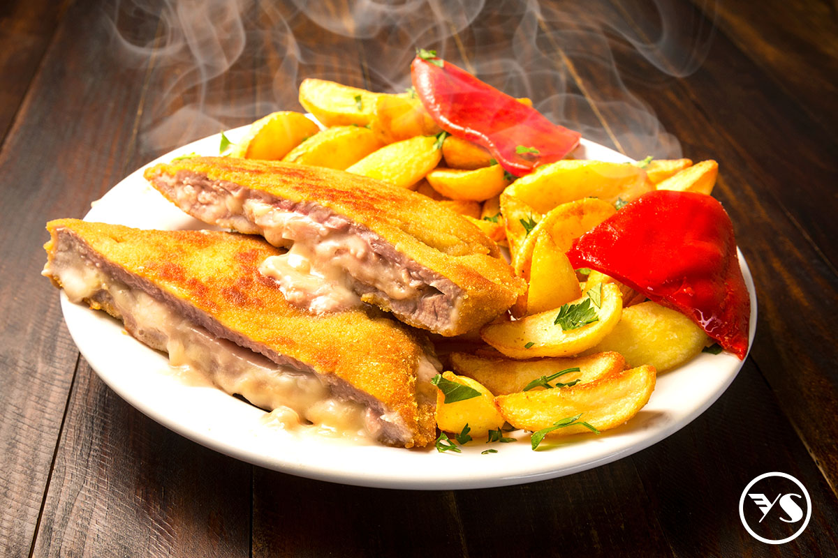 在西班牙阿斯圖里亞斯地區的招牌菜是 Cachopo (卡喬波),它將火腿、起司夾在兩片薄牛肉裡,裹粉炸得金黃酥脆,是份量十足的國民美食,Oviedo (奧維耶多) 當然是品嚐它的好地方,常見於當地餐廳,可品嘗到道地的在地風味。