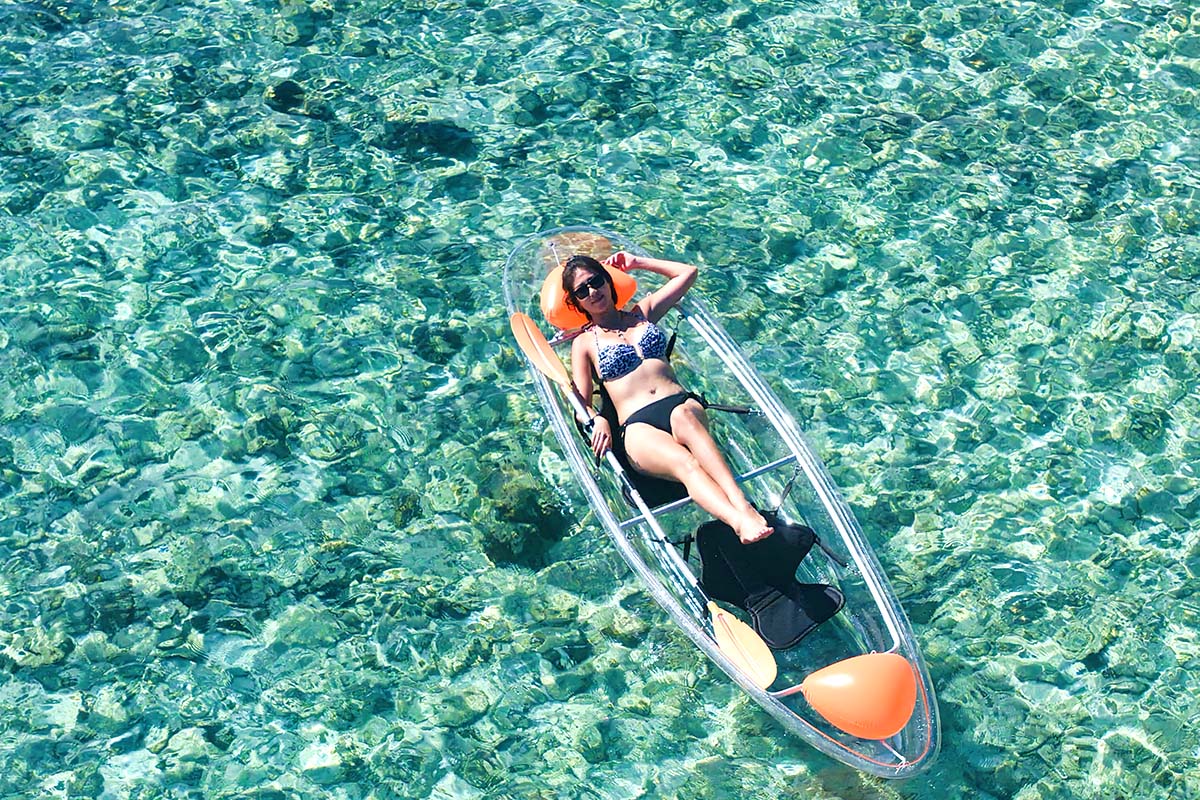宛如上帝遺落的寶石,靜靜漂浮在碧藍海面上。一靠岸,就被細白如粉的沙灘吸引,踩下去軟綿溫潤;海水清澈透明,珊瑚礁和色彩繽紛的小魚就在腳邊悠遊。也可以嘗試玻璃獨木舟,從透明船底欣賞海底世界,看魚群在腳下穿梭。