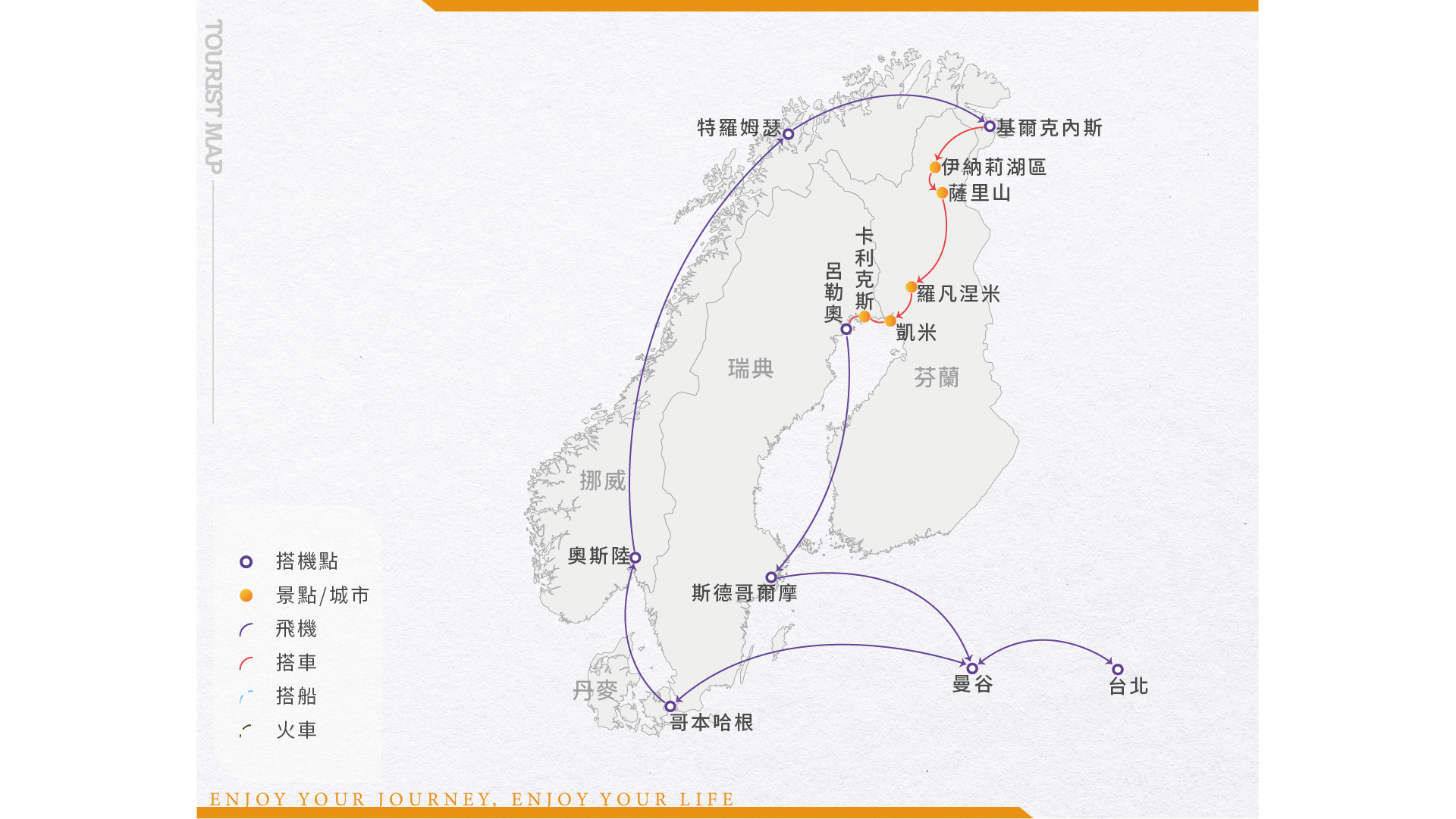 【極光】芬蘭人稱為Aurora Borealis,千百年來神秘而美麗的現象,成為北極圈範圍內珍貴的大自然奇觀。其形成原因是:太陽風和地球磁場在離地球90-160公里的高空碰撞,形成一百萬兆瓦放電現象。極光同時可發生在北半球和南半球,最佳觀測的時間是冬季,極光因太陽黑子活躍的時期而有11年循環一次的旺盛期。觀賞北極光的必要條件: