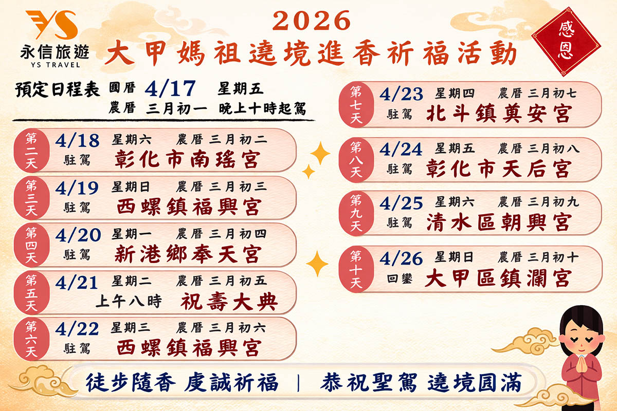★本行程進香活動行程須自行行走約6-10公里,請斟酌自行體力參與,謝謝!